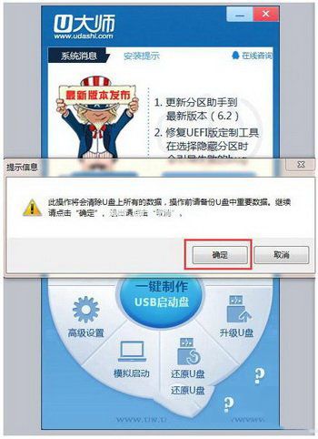 2、點擊“一鍵制作”,確定U盤里沒重要數據后點擊“確定”