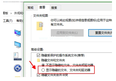 3、緊接著切換到查看選項(xiàng)卡,滾動鼠標(biāo),找到文件夾隱藏部分,點(diǎn)選顯示隱藏的文件和文件夾。