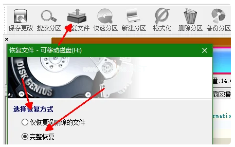 7、還有一種情況就是刪除造成的,還是使用這個(gè)軟件,選中U盤,選擇恢復(fù)文件,點(diǎn)選恢復(fù)誤刪除的文件或者是完整恢復(fù)都可以,待掃描完成之后,選擇相應(yīng)的文件夾進(jìn)行恢復(fù)操作即可。