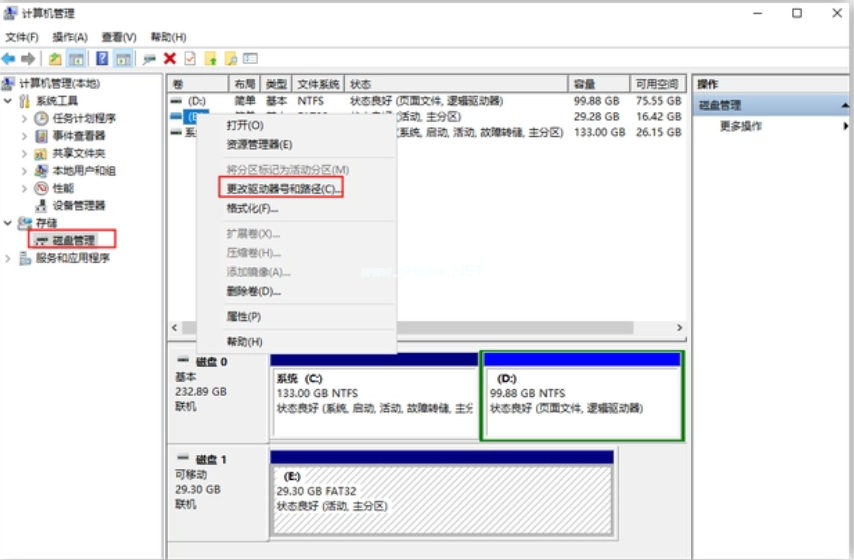 3. 右鍵點(diǎn)擊該磁盤,選擇“更改驅(qū)動(dòng)器號(hào)和路徑”,為其分配新的驅(qū)動(dòng)器號(hào)和路徑。