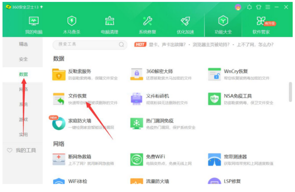 2、點(diǎn)擊左側(cè)的“數(shù)據(jù)”,選擇“文件恢復(fù)”添加,即可下載安裝好360u盤文件恢復(fù)工具。