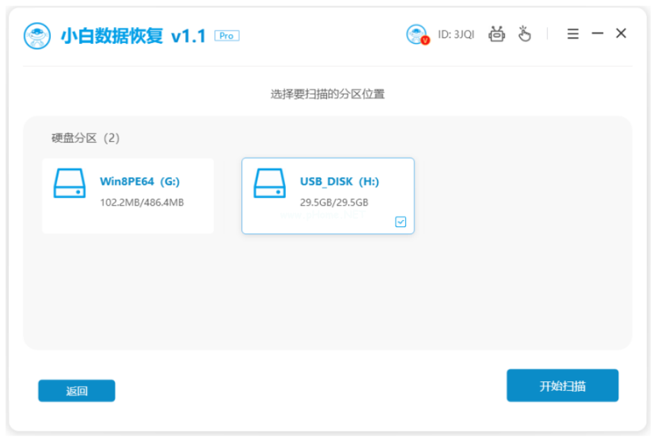 2、選擇誤刪文件所在的u盤分區(qū),單擊“開(kāi)始掃描”。
