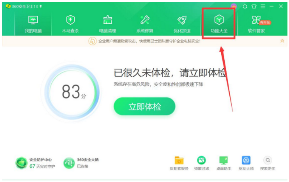 1、首先將u盤插入電腦中,打開(kāi)360安全衛(wèi)士后,點(diǎn)擊上方的“功能大全”。