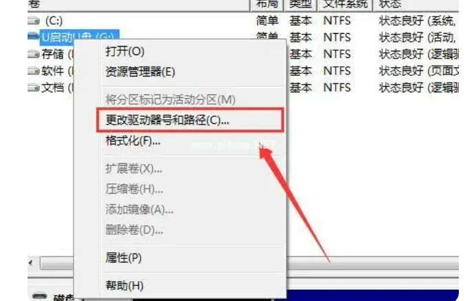 3、接著右鍵點擊無法正常顯示的U盤,選擇“更改驅(qū)動器和路徑”;