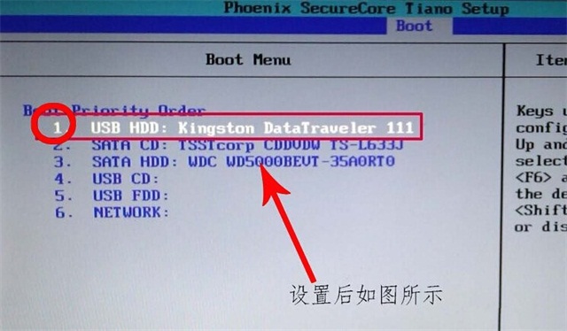 3、在BOOT界面中,選擇USB HDD,移動到第一選項