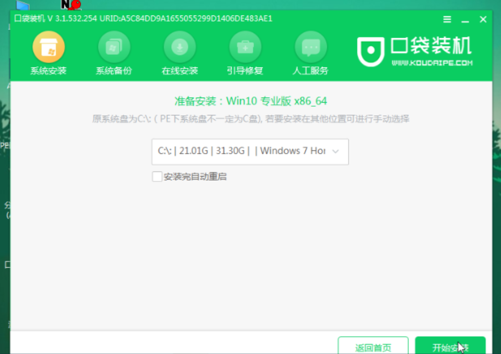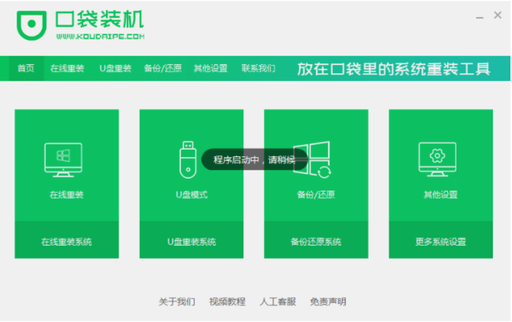1、首先我們打開【口袋裝機(jī)】工具,進(jìn)入到首頁當(dāng)中,選擇u盤重裝系統(tǒng)功能。