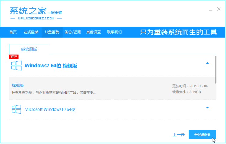 1、先在一臺好的電腦上插入空白8g以上u盤,下載安裝系統(tǒng)之家一鍵重裝系統(tǒng)工具選擇u盤模式打開,選擇開始制作。