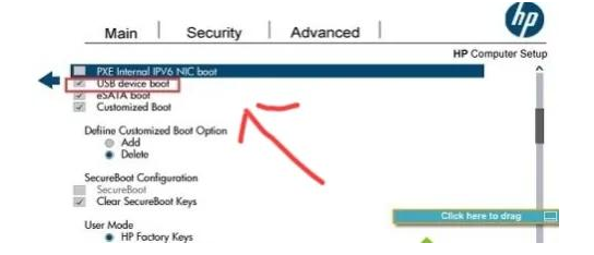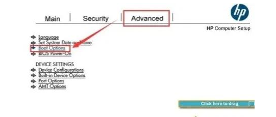 第二種:進(jìn)入電腦Bios設(shè)置U盤為第一啟動(dòng)項(xiàng)(當(dāng)?shù)谝环N方法使用快捷鍵啟動(dòng)無(wú)法選擇U盤時(shí)用此方法設(shè)置)。由于不同電腦進(jìn)入Bios設(shè)置U盤啟動(dòng)各有差異惠普電腦需要開(kāi)啟USB設(shè)備啟動(dòng):1、插入U(xiǎn)盤啟動(dòng)盤,開(kāi)機(jī)不停按擊F10鍵即可進(jìn)去BIOS,通過(guò)方向鍵左選擇Advanced(高級(jí)),選擇Boot Option(啟動(dòng)選項(xiàng))回車進(jìn)入,如下圖所示: