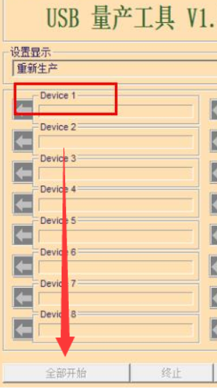 3、然后就會(huì)在框起來(lái)的地方檢測(cè)你的U盤,點(diǎn)擊全部開始,就會(huì)進(jìn)行修復(fù),完畢以后就重新拔下U盤再插入。