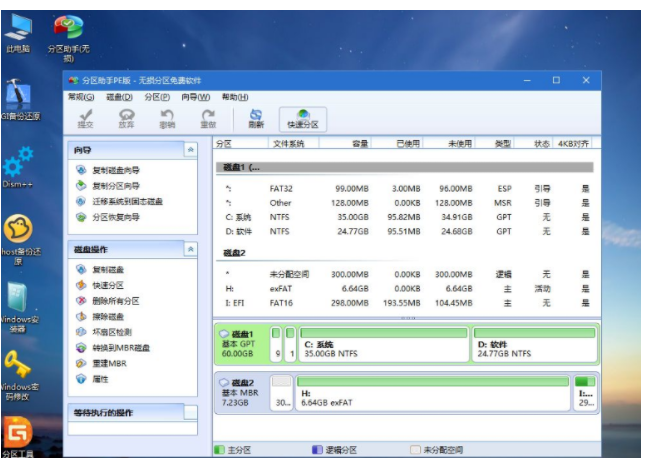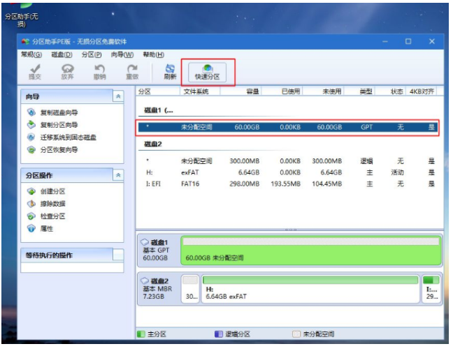 4、進入到pe之后,要在uefi下安裝win10系統(tǒng),硬盤需要GPT分區(qū)表,如果之前已經(jīng)是預裝win10機型,直接執(zhí)行第7步;如果需要全盤重新分區(qū),則雙擊桌面上的【分區(qū)助手(無損)】,選擇磁盤1,點擊【快速分區(qū)】,如果你是多個硬盤,要選對,不要誤刪;