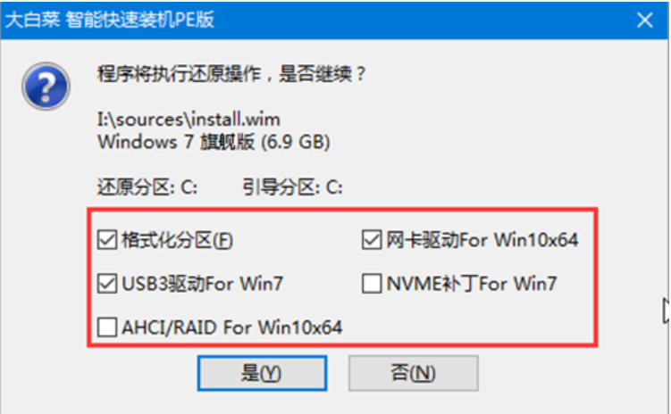 4、稍后彈出還原設(shè)置窗口,建議勾選“網(wǎng)卡驅(qū)動(dòng)”以及“USB驅(qū)動(dòng)”復(fù)選框,點(diǎn)擊“是”進(jìn)入下一步。