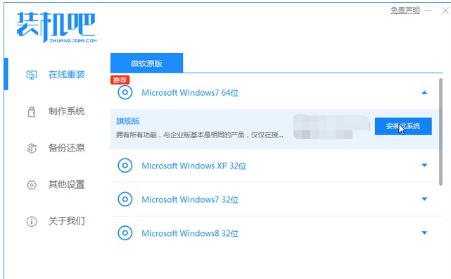 1、電腦安裝好裝機(jī)吧一鍵重裝系統(tǒng)軟件并打開,在這就可以下載安裝win7的64位系統(tǒng)