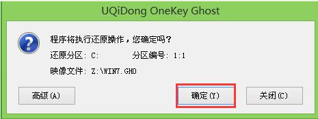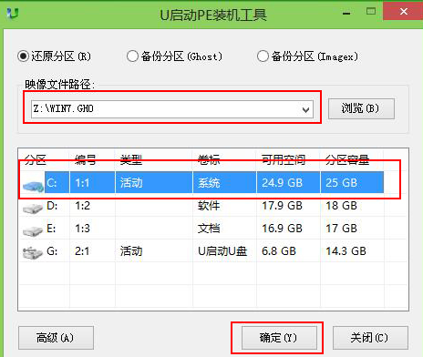 2、進入后系統(tǒng)自動識別u盤中所準備的win7系統(tǒng)鏡像,可如下圖選擇磁盤分區(qū),之后點擊“確定”