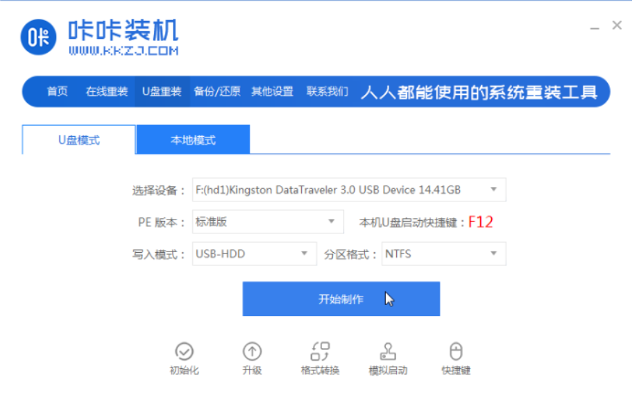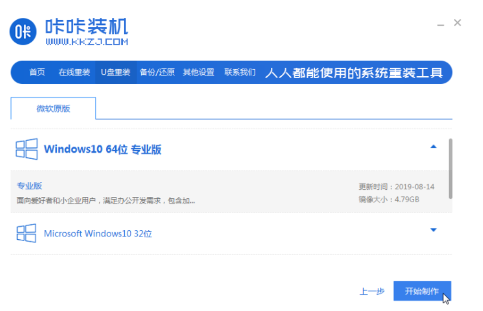 2.打開主頁后,選擇u盤重裝系統(tǒng)模式,點擊開始制作按鈕,選擇需要安裝的win10系統(tǒng)。
