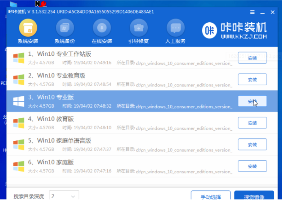 5.然后我們打開pe系統(tǒng)桌面上的卡卡安裝軟件,選擇win10系統(tǒng)點擊安裝選項。