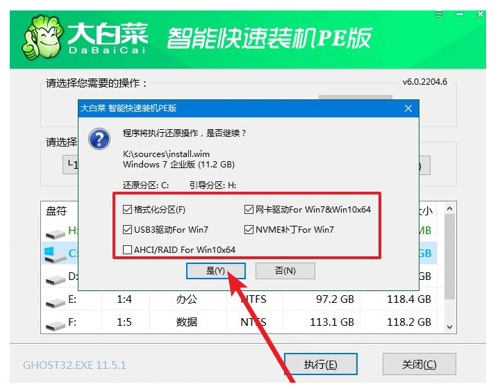 1、打開(kāi)大白菜一鍵裝機(jī)軟件,勾選安裝系統(tǒng),選擇需要重裝的映像文件,然后選擇安裝在“C盤”,三項(xiàng)都設(shè)置完成后點(diǎn)擊執(zhí)行。2、出現(xiàn)一鍵還原窗口時(shí),建議默認(rèn)勾選,注意檢查網(wǎng)卡和USB復(fù)選框,避免重裝系統(tǒng)后出現(xiàn)其他問(wèn)題,然后點(diǎn)擊“是”并等待軟件自行操作。