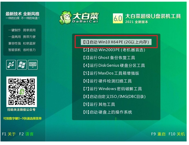 1、隨后將大白菜u盤啟動(dòng)盤插入需要重裝系統(tǒng)的電腦中,重啟并按下bios啟動(dòng)快捷鍵,通過(guò)鍵盤+鍵設(shè)置u盤為第一啟動(dòng)項(xiàng),隨后重啟電腦即可進(jìn)入u盤winpe主菜單。2、在大白菜winpe主菜單中,選擇[1]項(xiàng),然后回車即可進(jìn)入大白菜u盤winpe系統(tǒng)桌面。