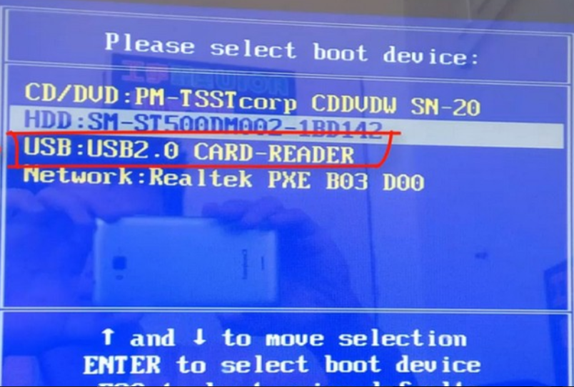 4.將u盤(pán)插入需要重新安裝的電腦,電腦重啟或開(kāi)機(jī)啟動(dòng)并迅速斷續(xù)地按下熱鍵,進(jìn)入快速啟動(dòng)菜單界面。
