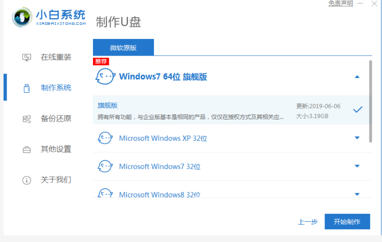 1、首先打開電腦,保持聯(lián)網(wǎng)以及供電狀態(tài),準備一個空白的8G以上的U盤,瀏覽器下載安裝好小白一鍵重裝軟件并打開,選擇制作系統(tǒng),點擊開始制作。