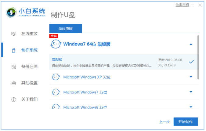 2、選擇我們所需要的win7操作系統(tǒng),點(diǎn)擊開始制作。