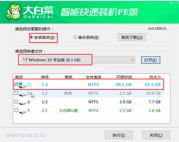 4.點擊打開桌面安裝工具,選擇“安裝系統(tǒng)”,“鏡像文件”選擇下載好的win7鏡像系統(tǒng),安裝到“C盤”,點擊“執(zhí)行”進(jìn)入下一步。