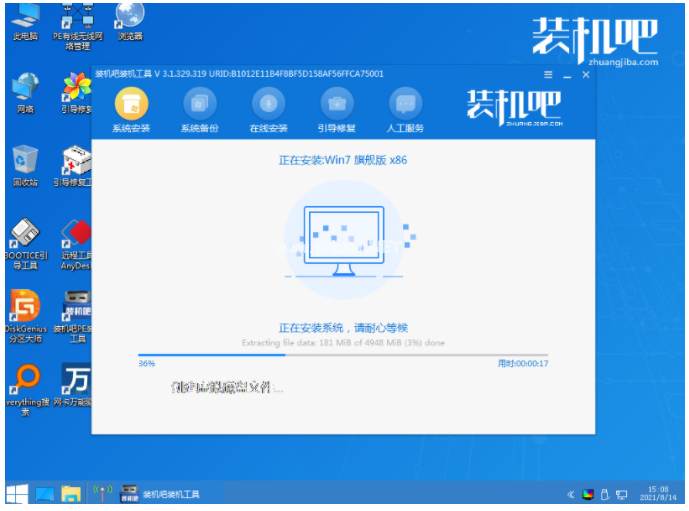 5、在pe系統(tǒng)桌面上點(diǎn)擊打開裝機(jī)吧裝機(jī)工具,選擇win7系統(tǒng)點(diǎn)擊安裝到系統(tǒng)盤c盤,點(diǎn)擊開始安裝。