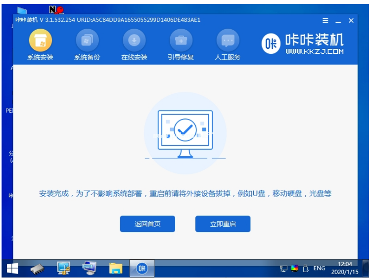 5、在pe系統(tǒng)的界面,點擊打開咔咔裝機工具選擇win7系統(tǒng)點擊安裝到系統(tǒng)盤c盤,提示系統(tǒng)安裝完成后重啟電腦。