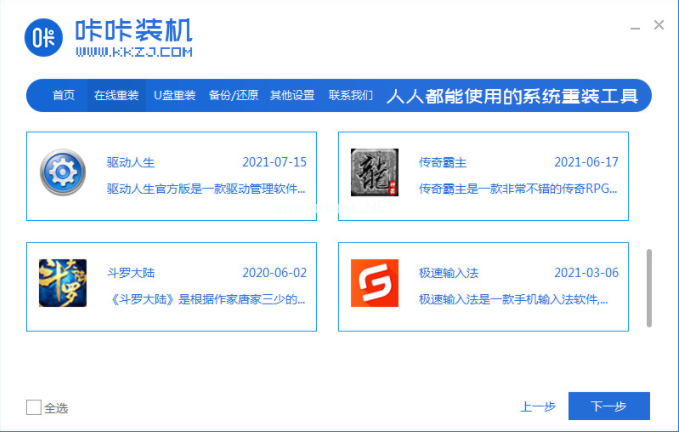 1、上網(wǎng)下載咔咔裝機(jī)工具,點(diǎn)擊在線重裝系統(tǒng)。