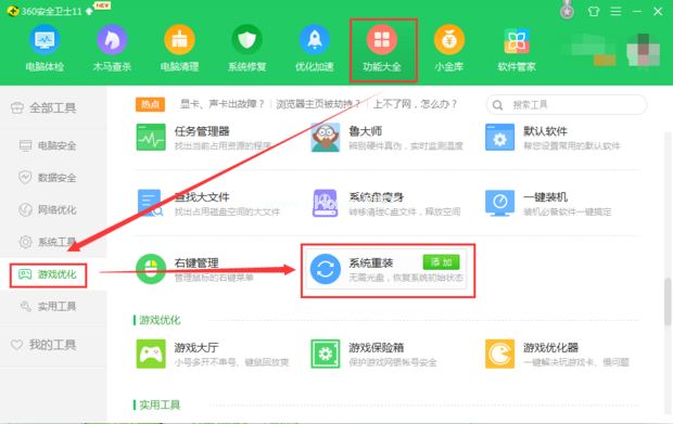 1、首先進入360安全衛(wèi)士的功能大全(也可以用360搜索一下“360系統(tǒng)重裝大師”進入官網(wǎng)直接下載),再點擊左邊的系統(tǒng)工具中的系統(tǒng)重裝下載安裝好。
