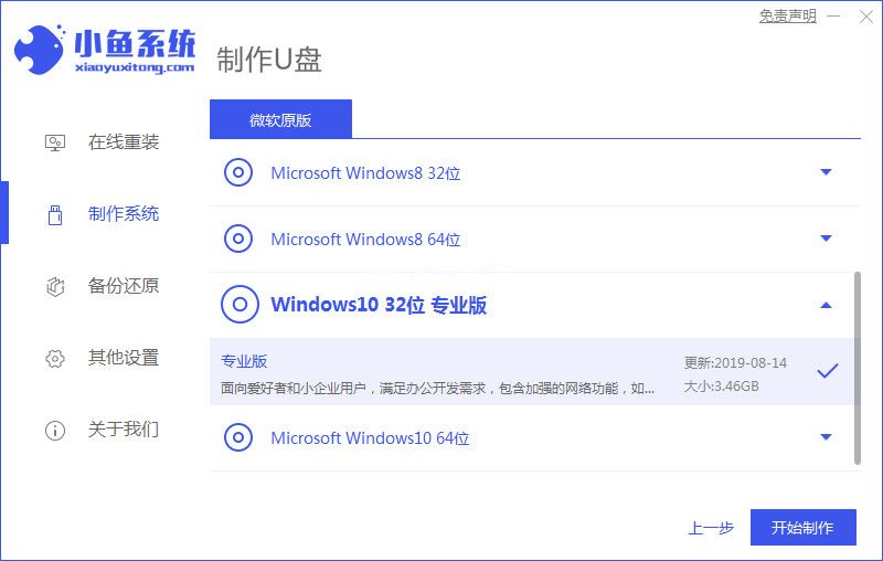 2、選中win10的鏡像,點(diǎn)擊頁(yè)面下方的【開(kāi)始制作】。