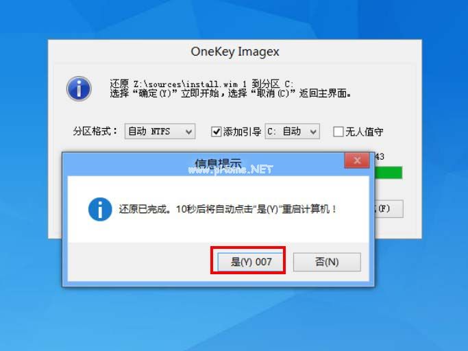 5、系統(tǒng)安裝工具此時(shí)將會(huì)將原版win10專業(yè)版系統(tǒng)鏡像包釋放到所選擇的分區(qū)當(dāng)中,釋放完成后所出現(xiàn)的提示重啟窗口界面中可點(diǎn)擊確定或者等待10秒讓電腦重新啟動(dòng)。