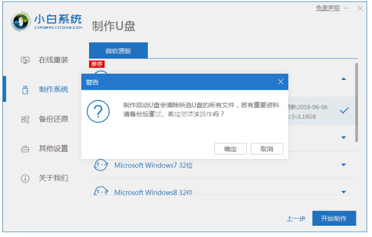 3、這時(shí)會(huì)彈出格式化U盤操作,在確定保存好重要數(shù)據(jù)以后,點(diǎn)擊“確認(rèn)”,耐心等待U盤制作完成以后,點(diǎn)擊重啟電腦。