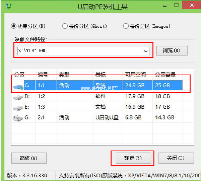 2、進(jìn)入PE系統(tǒng)U啟動裝機(jī)工具以后,選擇好你之前拷貝在系統(tǒng)中的win7系統(tǒng),默認(rèn)選擇C盤,然后點擊下面的【確定】。