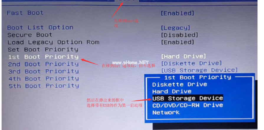 2、通過(guò)bios快捷鍵進(jìn)入boot頁(yè)面,設(shè)置u盤為第一啟動(dòng),然后重啟。
