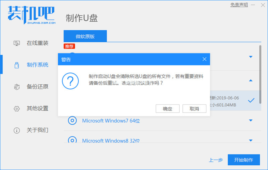 1、下載安裝裝機(jī)吧系統(tǒng)軟件,將u盤插入電腦,點(diǎn)擊制作u盤,選中插入的u盤,點(diǎn)擊開始制作。