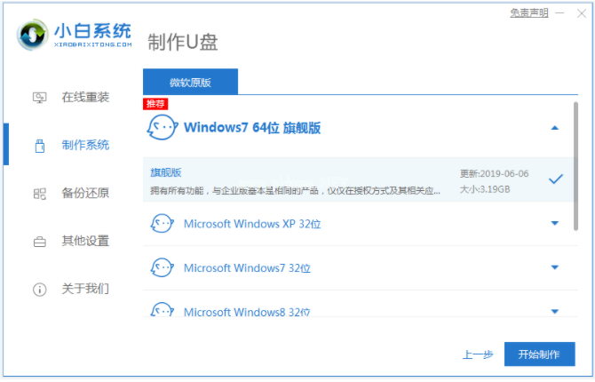 2、選擇需要安裝的系統(tǒng),點(diǎn)擊開(kāi)始制作啟動(dòng)盤。