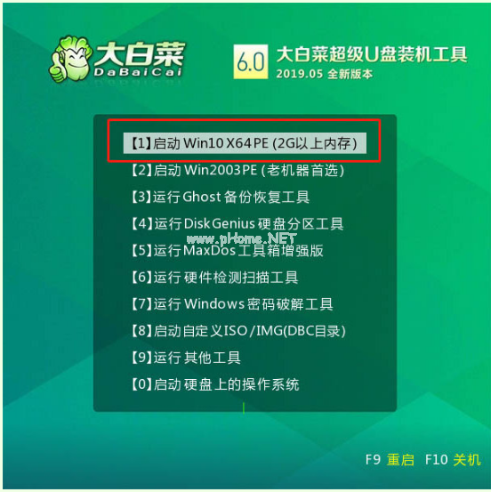 2、然后選擇【1】Win10X64PE(2G以上內(nèi)存),按回車(chē)鍵進(jìn)入大白菜PE界面。