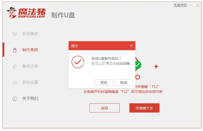 3、大家耐心等待軟件制作u盤啟動(dòng)盤,然后快速預(yù)覽需要安裝的電腦主板的啟動(dòng)熱鍵,再拔除u盤退出。