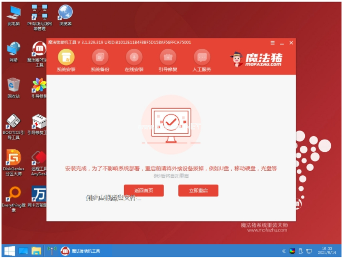 5、軟件自動開始安裝,提示完成后選擇重啟電腦。
