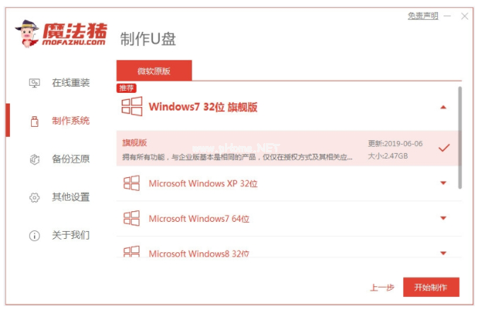 2、選擇win7系統(tǒng),接著點擊開始制作。