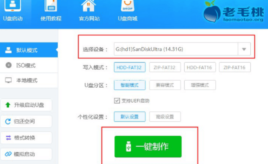 2、接著把U盤插到電腦上面,同時(shí)打開安裝好的老挑毛u盤啟動(dòng)工具。自動(dòng)檢測(cè)到U盤,默認(rèn)點(diǎn)擊 一鍵制作。